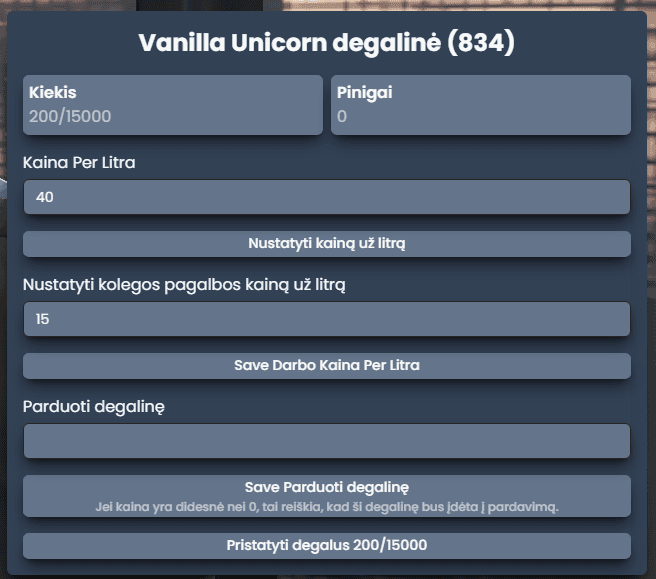 Išsaugoti degalinės pardavimo nustatymus– Išsaugokite pardavimo informaciją; jei nieko nebus įvesta, degalinė nebus parduodama. -