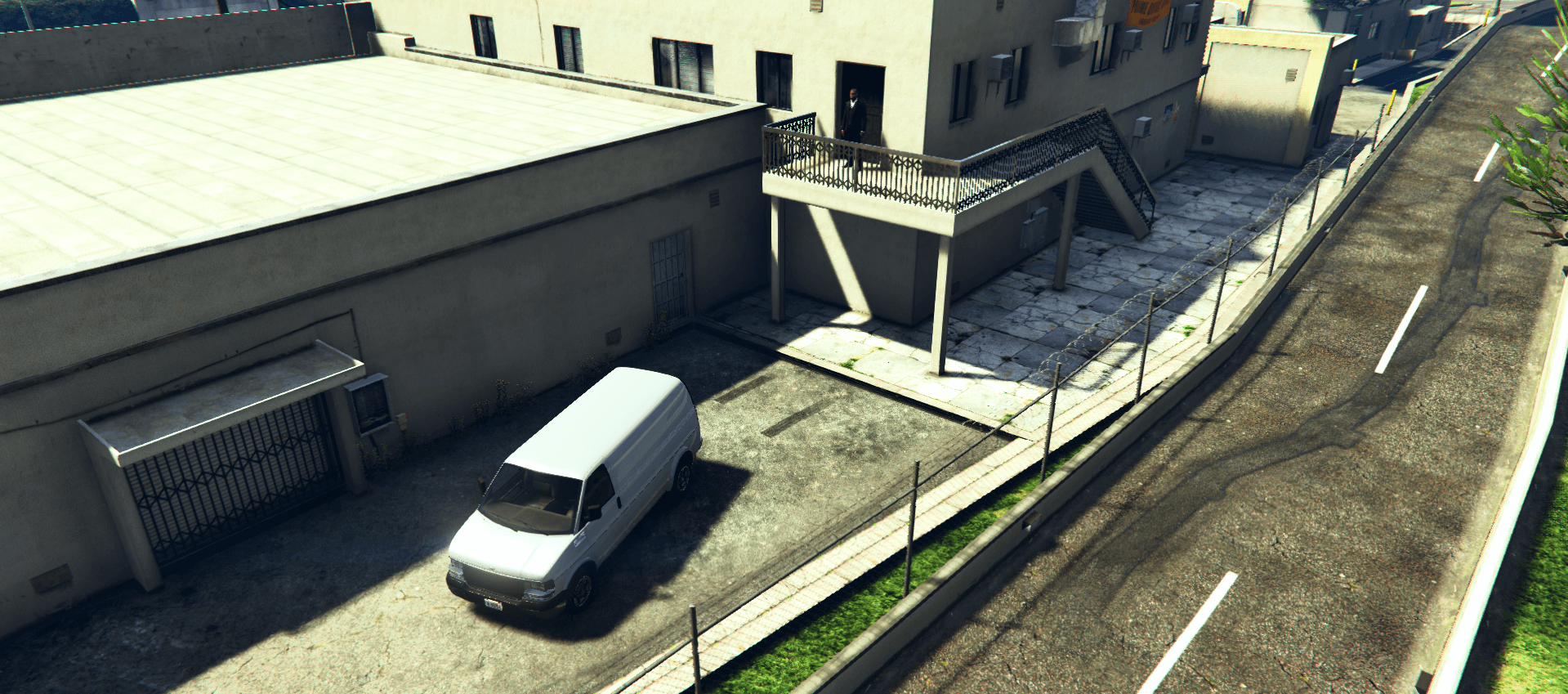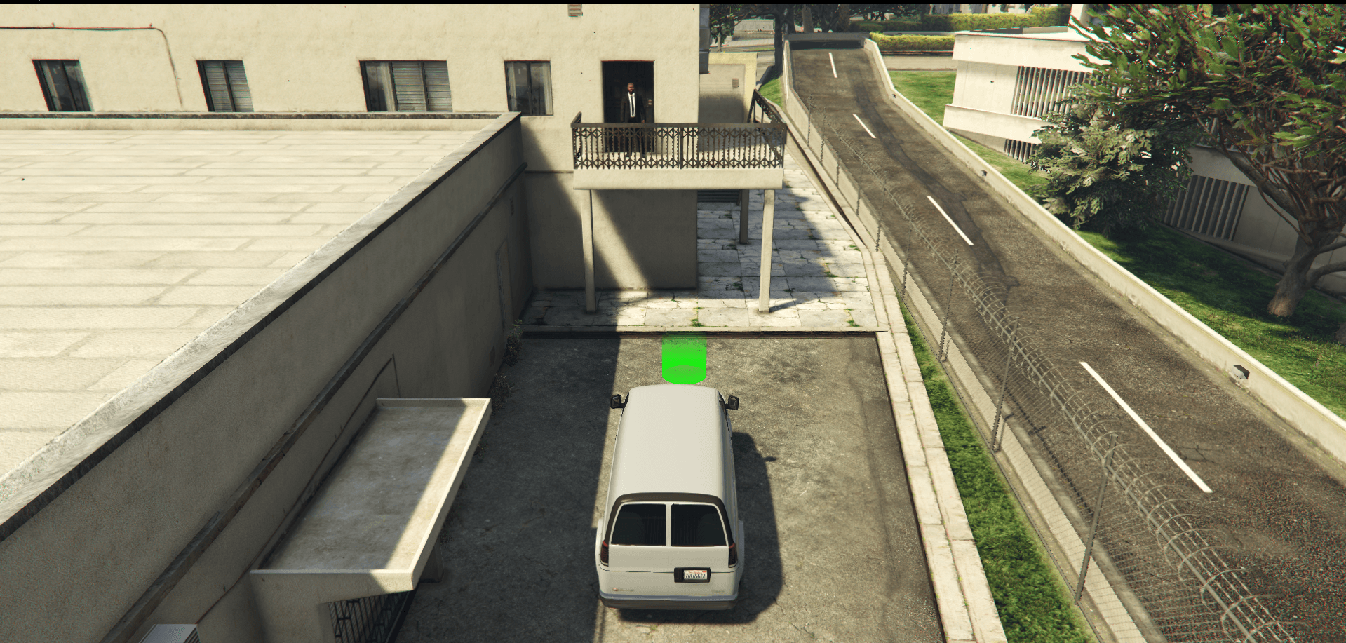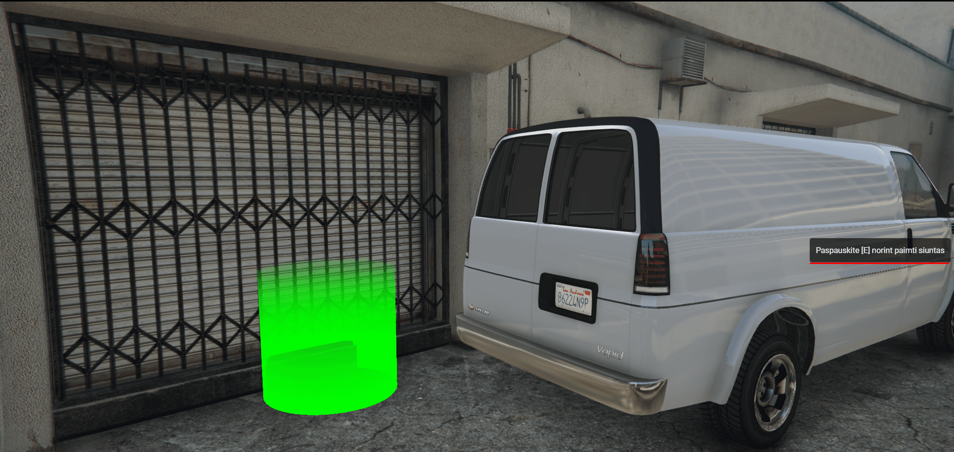 Pradėjus darbą, gausite transporto priemonę. Transporto priemonę priparkuokite prie sandėlio ir pradėkite krauti siuntas į transporto priemone su spausdami [E].