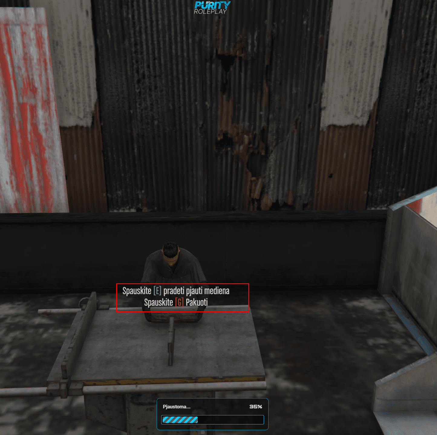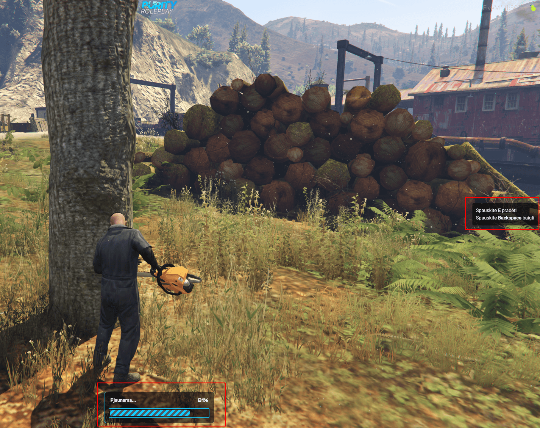 Pradėjus darbą, jūs užsivilgsite darbo drabužius ir gausite benzininį pjuklą (kuris nebus pridėtas į inventorių). Tada eikite prie medžių ir pradėkite juos pjauti, laikydami nuspaudę ALT ir spausdami "Pradėti".