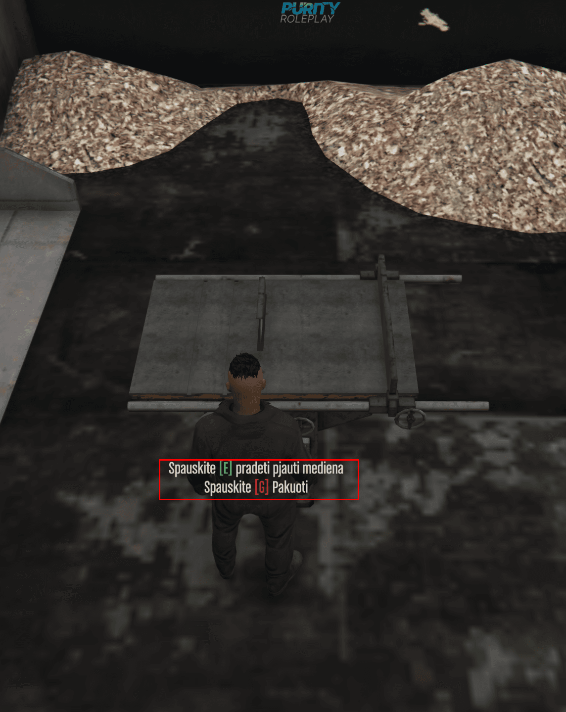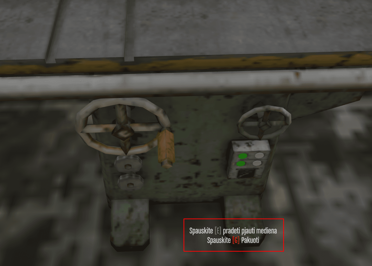 Prisipjovę pakankamai medienos, keliaukite iki kitos pažymėtos vietos žemėlapyje, kur patebėsite kad reikia spausti E.